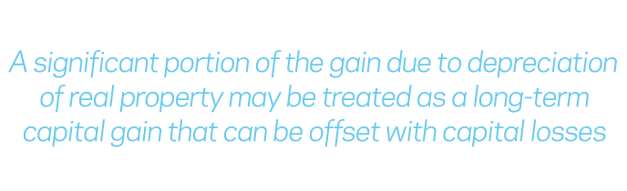 So, when it comes to real estate, depreciation has two tax characters. During the useful life of the property, depreciation can be used as an ordinary deduction against passive income. Later, upon the sale of the property, a substantial portion of such cumulative depreciation may be treated as a long-term capital gain. What this means for investors is losses realized from underperforming stocks (or other capital losses, including those carried forward from prior years) can be used to offset a meaningful portion of gains from the sale of real estate.