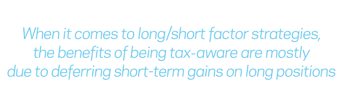 This might be surprising, since for passively indexed strategies such as direct indexing, the source of so-called “tax alpha” is clearly from harvesting losses. 2 2 Close There’s a reason these are called tax-loss harvesting strategies, after all… But when it comes to long/short factor strategies, it’s mostly the opposite. The benefits of being tax-aware are mostly due to deferring short-term gains on long positions—sometimes it pays to wait! (In contrast, the tax-agnostic version would trade to realize those gains in pursuit of pre-tax alpha.)