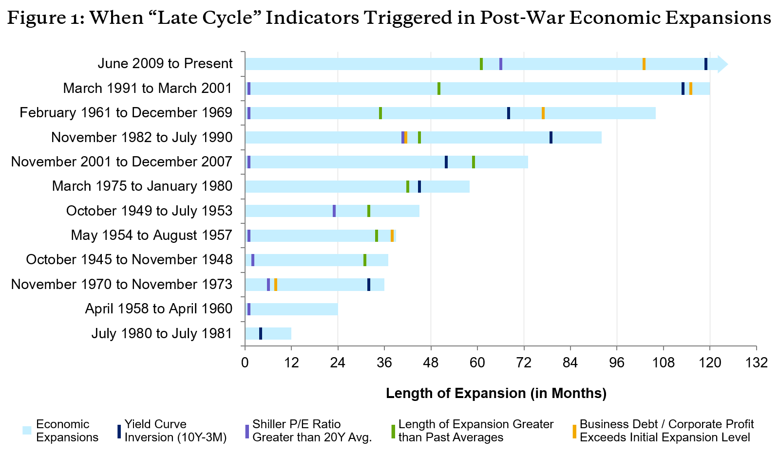 The current economic expansion recently celebrated its tenth anniversary, becoming the longest period of sustained growth in U.S. history. 1 1 Close Source: National Bureau of Economic Research (NBER). Dating of business cycle expansions and contractions extends back to December 1854. With the passing of this milestone, the phrase “late cycle” has grown increasingly popular among strategists and investors alike. Describing the environment this way conveys a certain sobriety (“I know the bull market can’t last forever”), but the lack of a clear definition or forecast horizon leaves room for a wide range of potential actions (or inactions). If the hour is late, are we supposed to prepare for the worst or maximize returns while the good times last? 2 2 Close In some ways, “late cycle” pronouncements are reminiscent of the Stark family slogan “winter is coming” in Game of Thrones, which expresses a grim pessimism that may not translate into good decision-making or a high survival rate among its proponents.